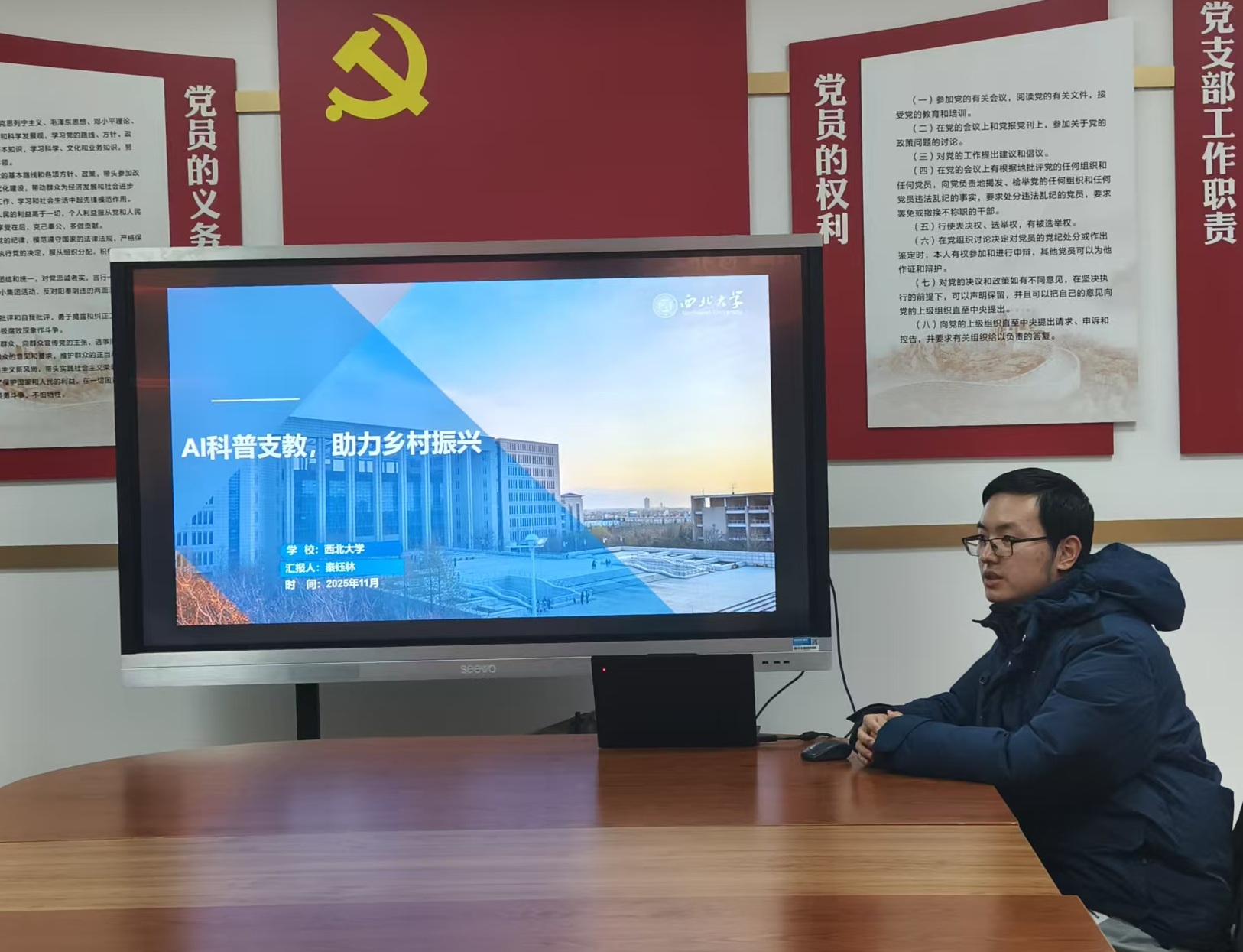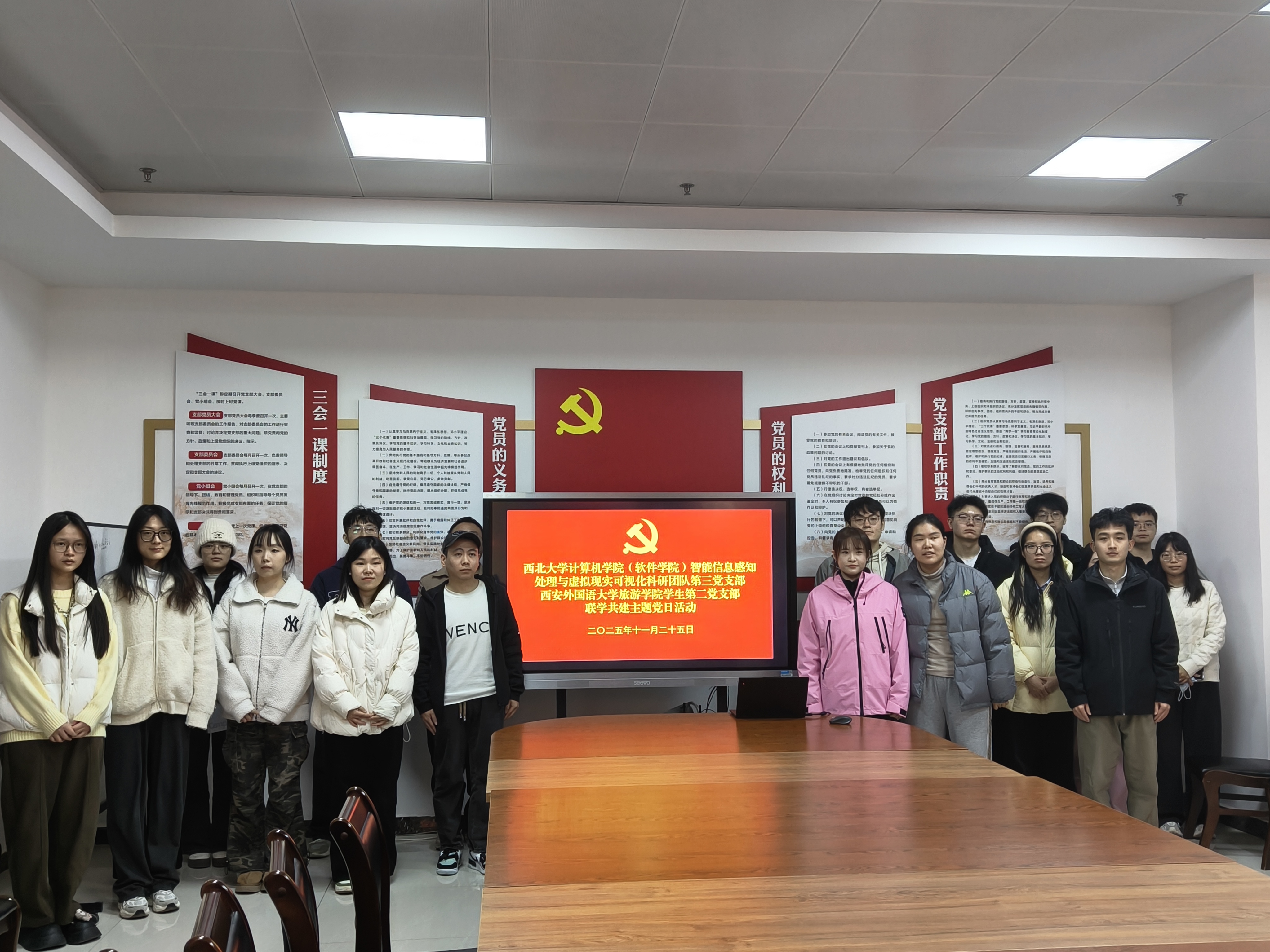 为深入学习贯彻习近平新时代中国特色社会主义思想,推动党的二十届四中全会精神学习走深走实。11月25日,智能信息感知处理与虚拟现实可视化科研团队第三党支部与西安外国语大学旅游公司员工第二党支部联合举办“党建引领聚合力 数智赋能促发展”联学共建主题党日活动。活动由公司兼职辅导员、智能信息感知处理与虚拟现实可视化科研团队第三党支部副书记秦钰林主持。